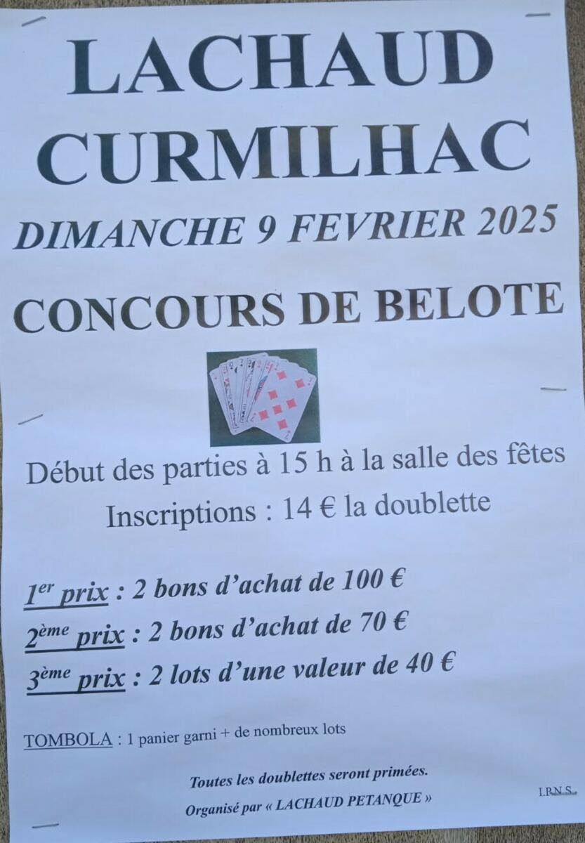 L'association Lachaud Pétanque organise un concours de belote le dimanche 9 février 2025 à la salle des fêtes de Lachaud.