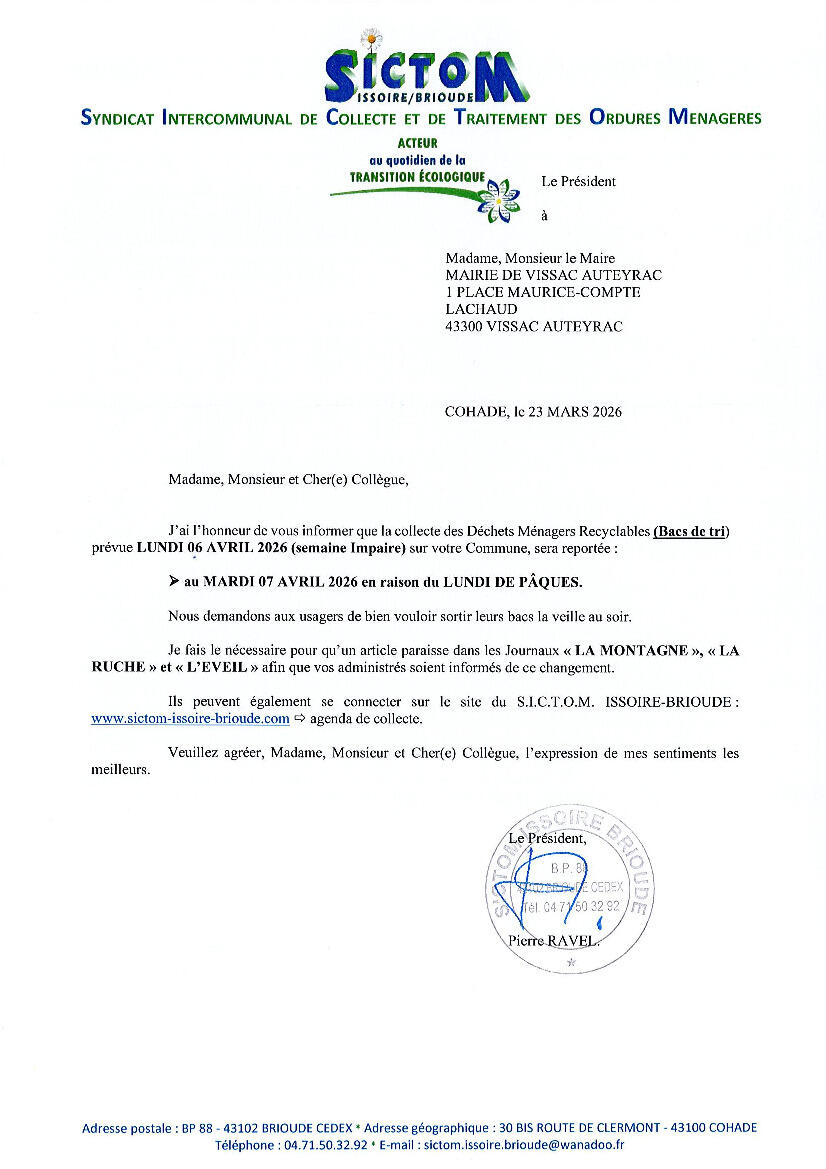 La collecte des déchets recyclables prévue le lundi 6 avril 2026 est reportée au mardi 7 avril 2026 en raison du lundi de Pâques.