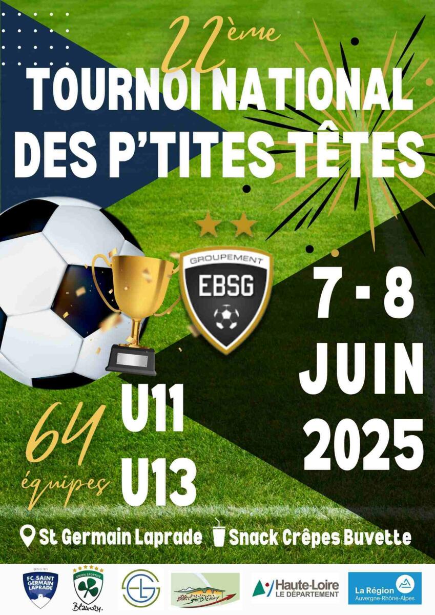 Les 7 et 8 juin 2025, 22ème édition du Tournoi National de foot des P'tites Têtes organisé  par L'EBSG au stade de Saint-Germain Laprade.