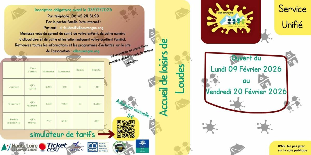 Vous trouverez donc ci-joint les plaquettes des centres de loisirs de Loudes et de Saint-Paulien : les plannings d'activités seront disponible à partir du mardi 27 janvier sur villeauvergne.org.