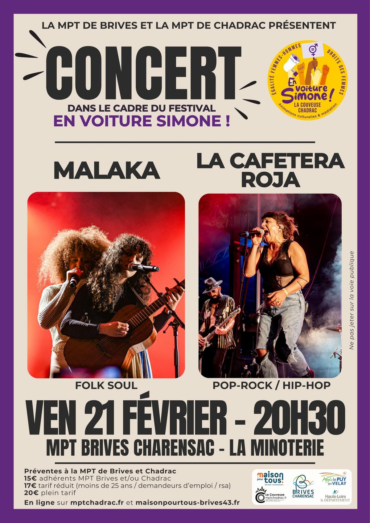 ▶ Dans le cadre du festival "En voiture Simone !" venez assister au concert de Malaka et La Cafetera Roja, vendredi 21 février, à la Maison Pour Tous de Brives-Charensac.