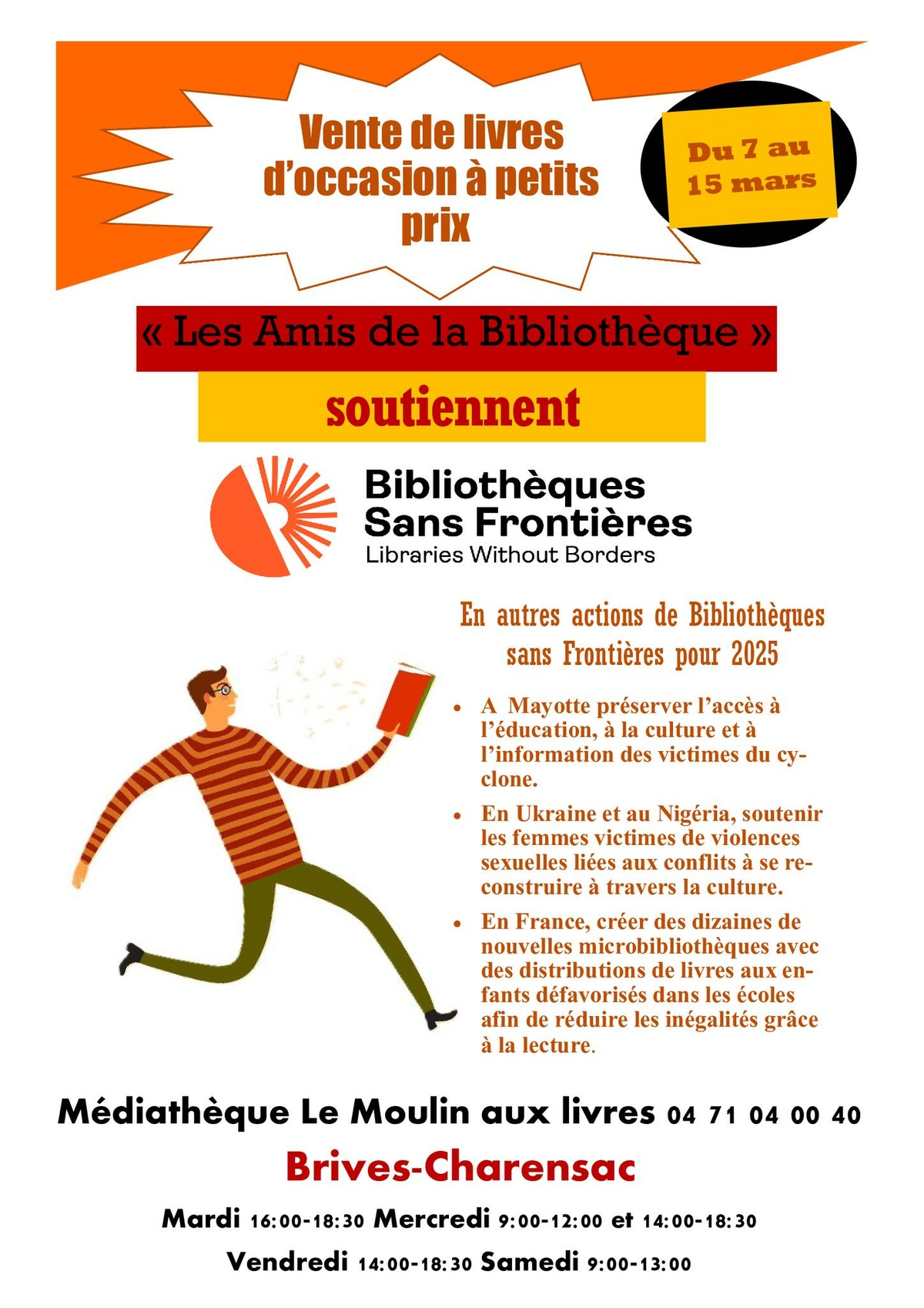 L'association "Les amis de la bibliothèque" vous propose une vente de livres aux profits de Bibliothèques sans frontières du 7 au 15 mars aux heures d'ouverture de la Médiathèque Le Moulin Aux Livres de Brives-Charensac.
