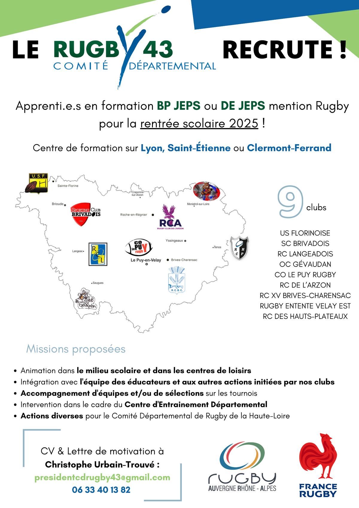 Le CD Rugby 43 recrute de nouveaux apprentis 24/2/25 Le CD Rugby 43 recrute de nouveaux apprentis pour la saison sportive 2025/2026.