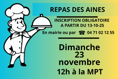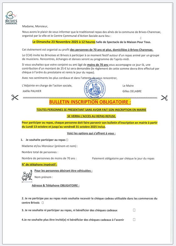 Repas des aînés INSCRIPTIONS OBLIGATOIRES avant le 31-10-25 23/10/25 Source : Mairie de Brives-Charensac