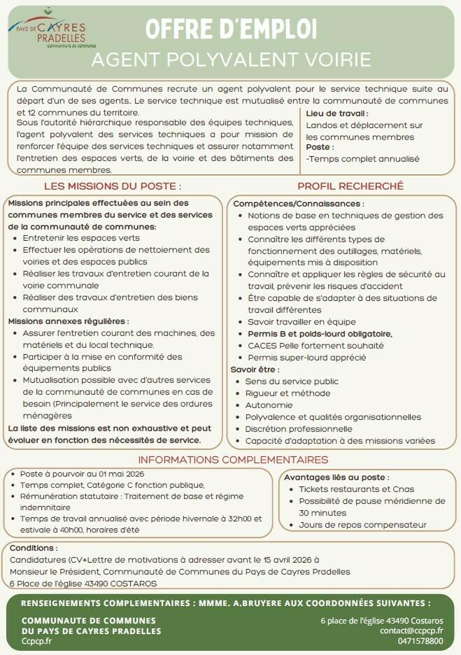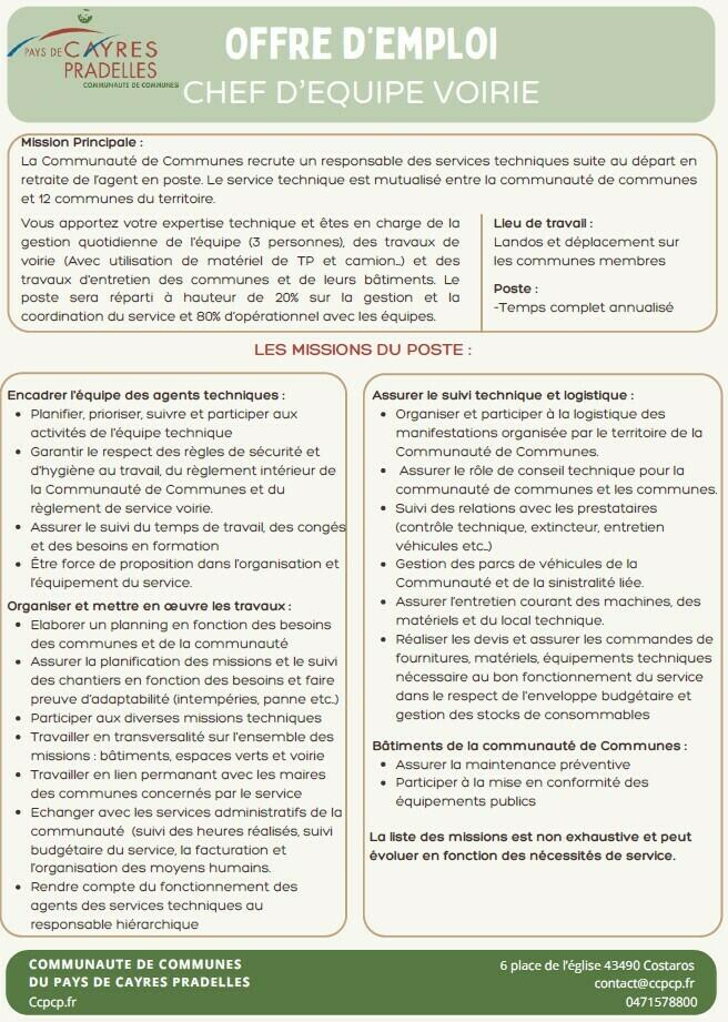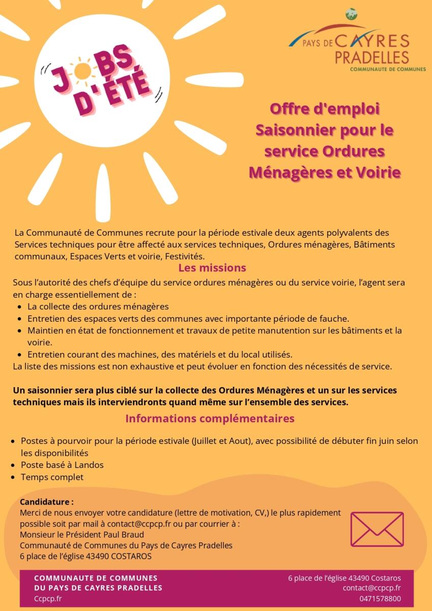 Plusieurs offres d'emploi ont été diffusées dernièrement par la Communauté de Communes du Pays de Cayres Pradelles.