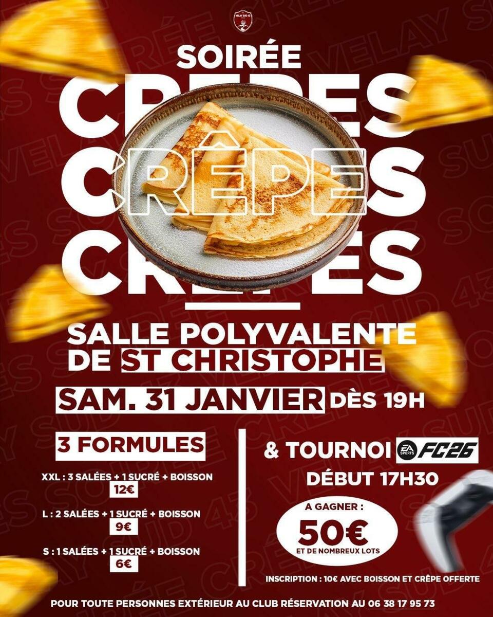 En parallèle, une soirée crêpes sera organisée le samedi 31 janvier 2026 à partir de 19 heures, toujours à la salle polyvalente de Saint-Christophe-sur-Dolaizon.