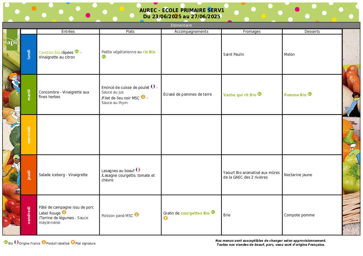Menus du 29 septembre 2025 au 03 octobre 2025