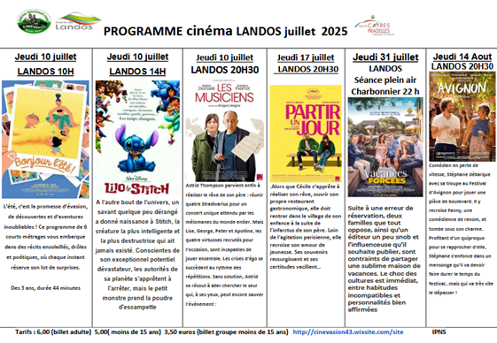 Nouveau programme cinéma 4/6/25 Voici le nouveau programme de cinéma ! A vos agendas ! NOTEZ UNE SEANCE EN PLEIN AIR A CHARBONNIERLE JEUDI 31 juillet à 22h.