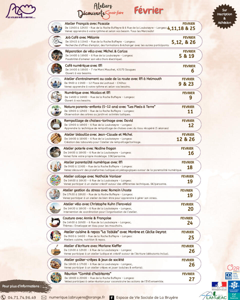 Ateliers de la Bruyère 6/2/26 Nous vous invitons à prendre connaissance du programme de février 2026. Source : Mairie de Langeac