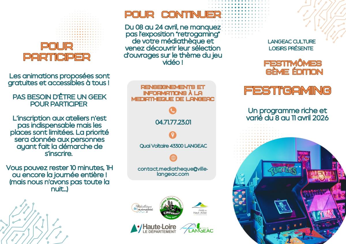 Organisée en partenariat avec le LCL (Langeac Culture Loisirs), la Communauté de Communes des Rives du Haut-Allier et la Médiathèque Départementale, du 8 au 11 Avril, nous vous donnons rendez-vous pour Festi'Gaming.