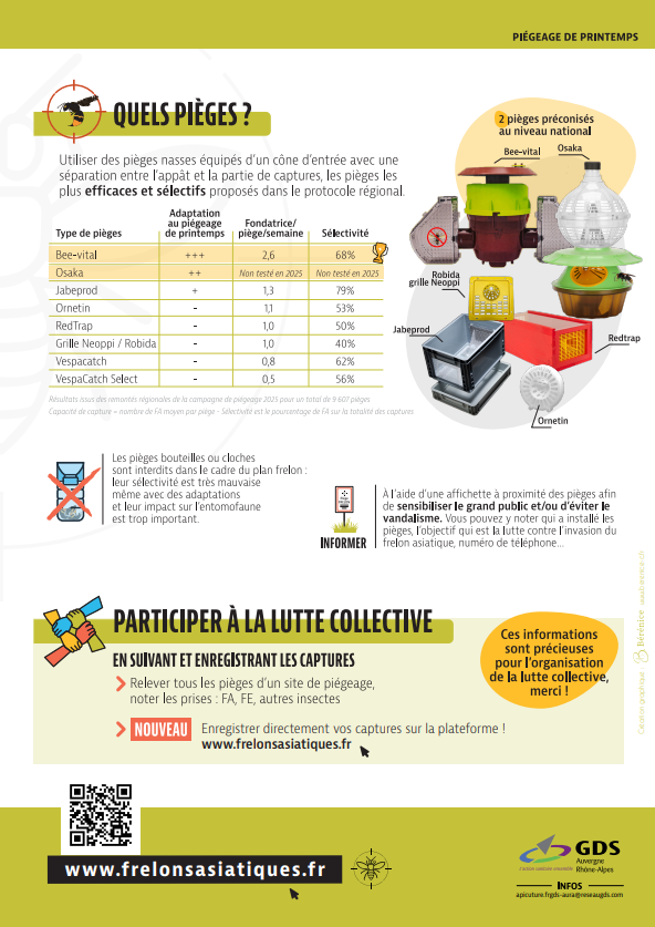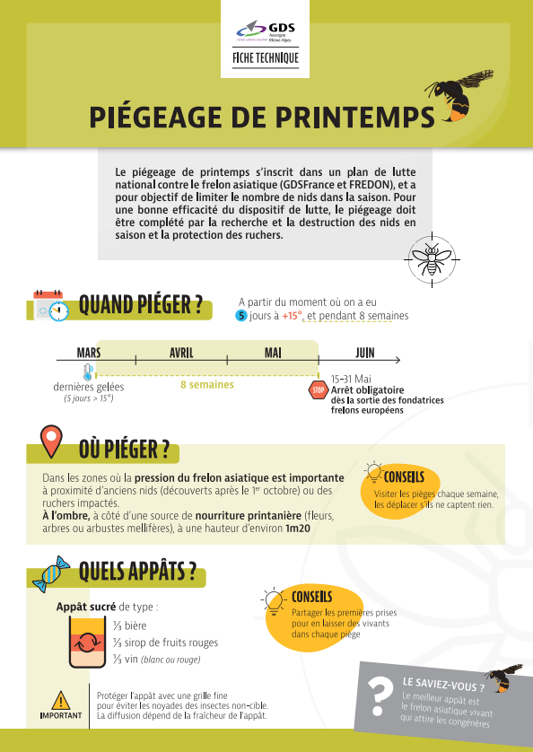 Le piégeage de printemps consiste à capturer les fondatrices (=reines) de sorte qu’elles ne constituent pas une colonie, contenant plusieurs milliers d’insectes et qui ensuite engendra plusieurs centaines de nouvelles fondatrices pour la saison suivante. Cette méthode s’inscrit dans une logique globale de lutte contre le frelon asiatique, combinant plusieurs actions à plusieurs périodes de l’année.