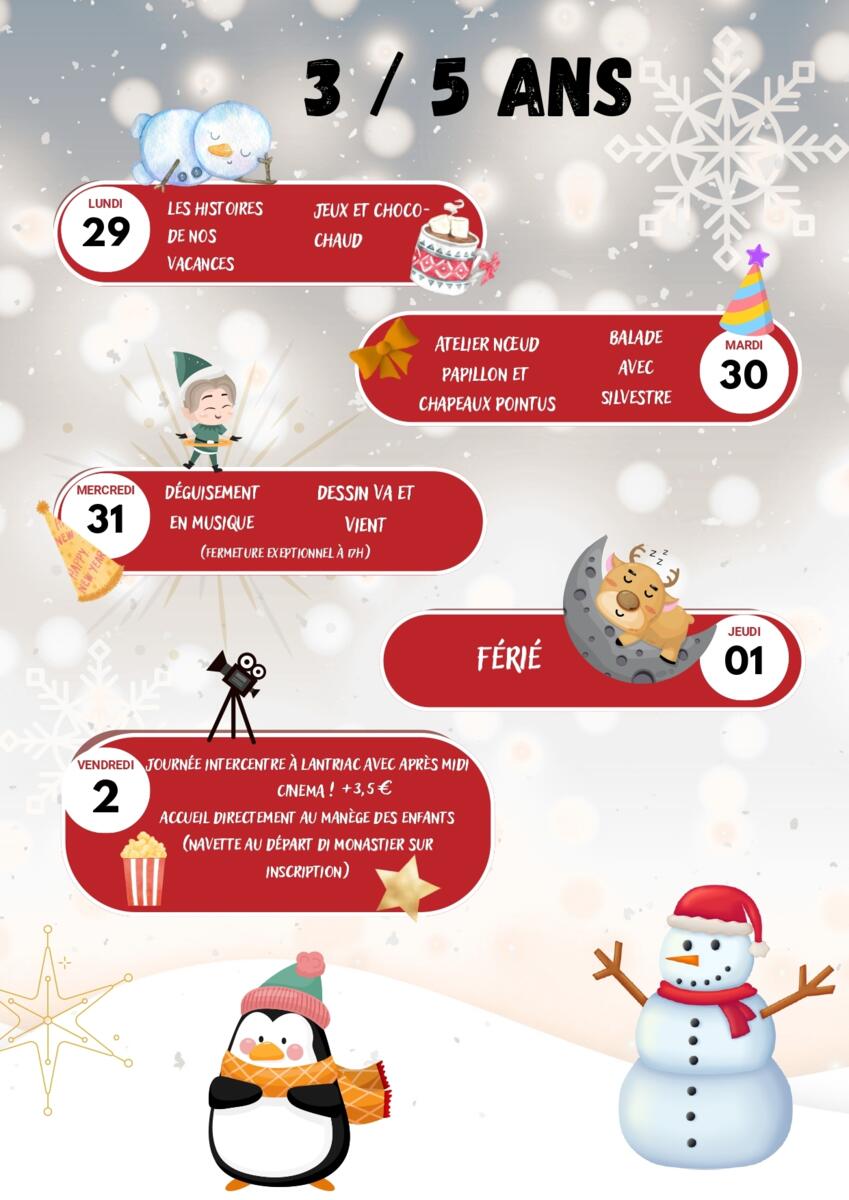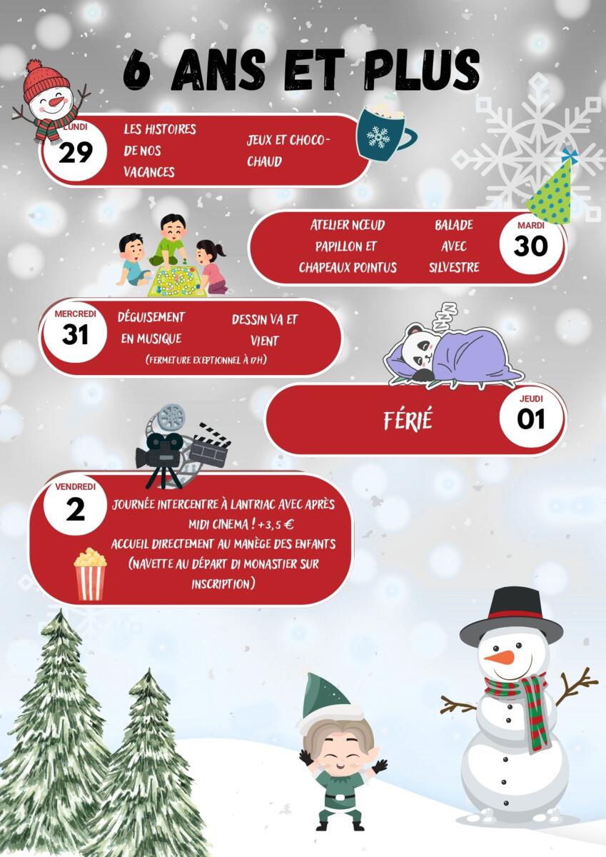 Programmes des vacances de fin d'année, du 29 Décembre au 02 Janvier, des centres de loisirs du Monastier et de Lantriac.