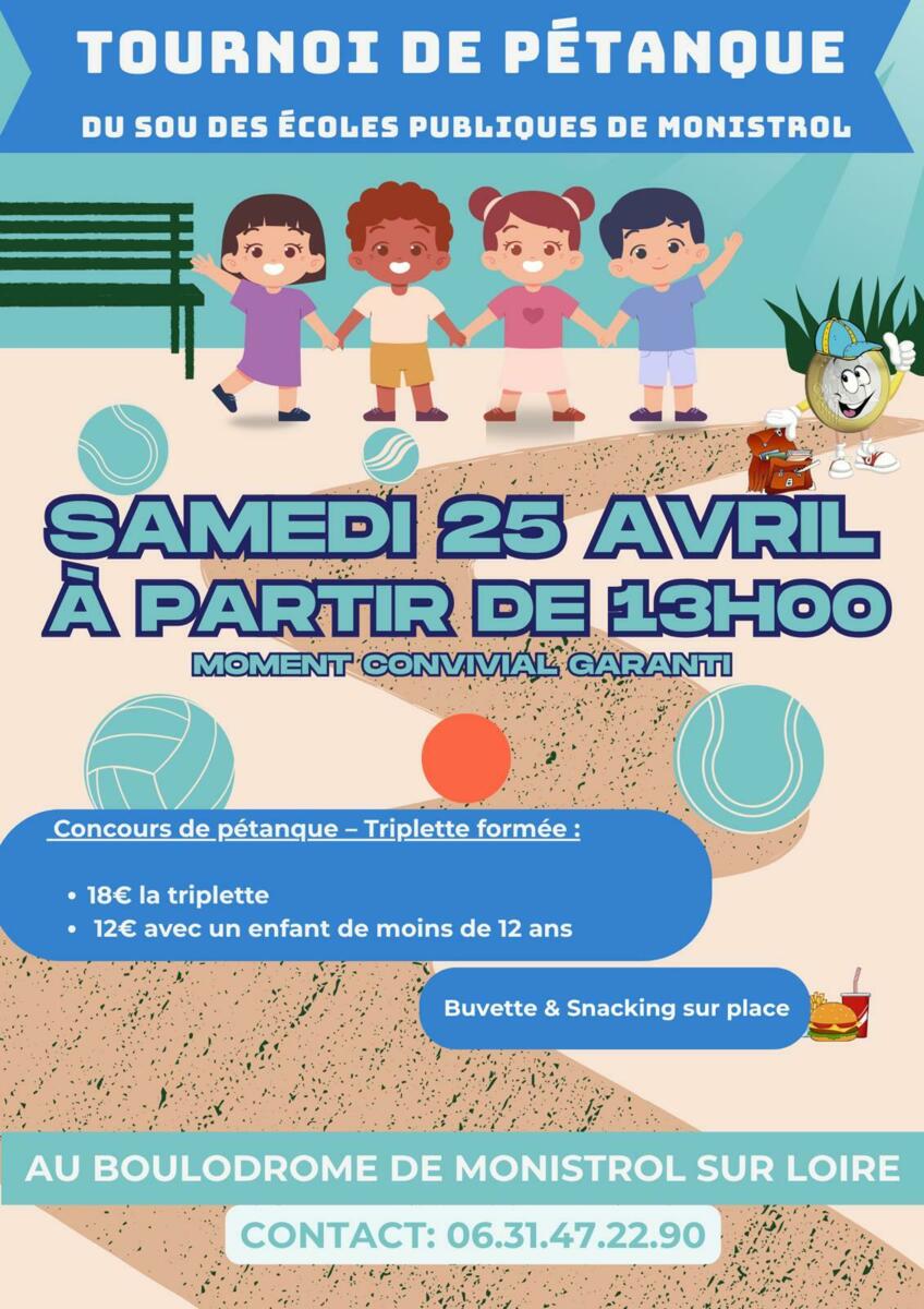 Samedi 25 avril : 2e concours de pétanque du Sou des écoles à partir de 13H30 au boulodrome des Ages à Monistrol sur Loire.