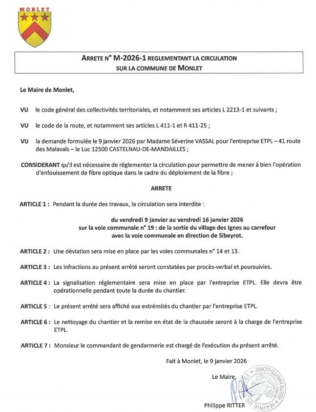 Pour permettre la poursuite de la pose de la fibre, la circulation sera interdite du 9 janvier au 16 janvier de la sortie du village des Ignes au croisement de la route de Sibeyrot.