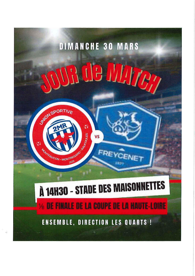 Se disputera le 1/8 de finale de la coupe de la Haute Loire entre US2MR et Freycenet de St Jeures au stade des Maisonnettes à 14h30.