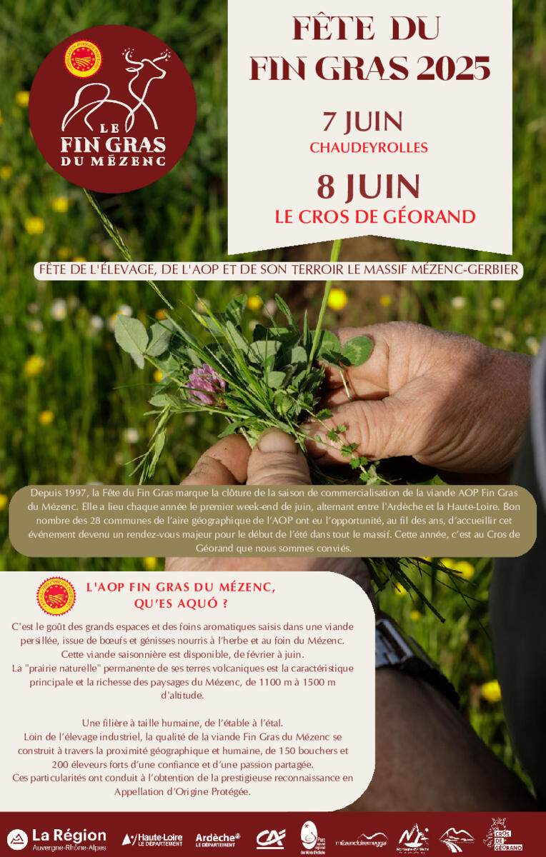 Depuis 1997, la Fête du Fin Gras marque la fin de la saison de commercialisation de la viande AOP Fin Gras du Mézenc. Elle vise à mettre en valeur les savoir-faire du territoire Mézenc Gerbier et à faire découvrir notre territoire au plus grand nombre.