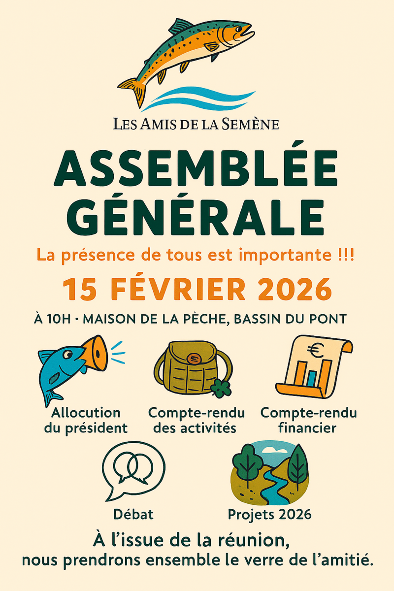 Les Amis de la Semène vous convient à leur assemblée générale qui se tiendra le samedi 15 février à 10h00 à la maison de la pêche.