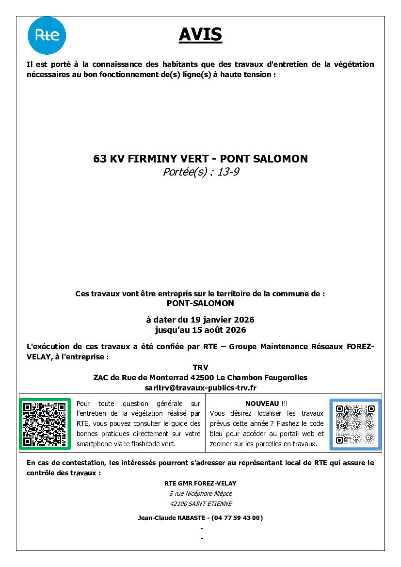 RTE vous informe que des travaux d'élagage et d'abattage vont être entrepris prochainement sur le territoire de Pont-Salomon, afin d'assurer le bon fonctionnement des lignes hautes tension mais également la sécurité des personnes aux abords de ces ouvrages.