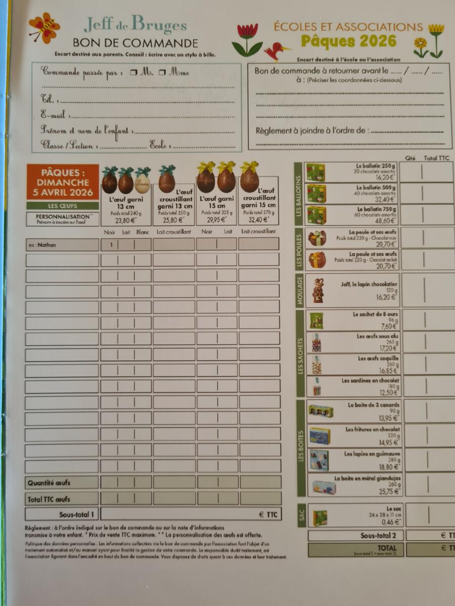 Chocolat de Pacques du Comité de jumelage 9/3/26 Vente de chocolats de Pâques Jeff de Bruges pour le Comité de Jumelage de St André
