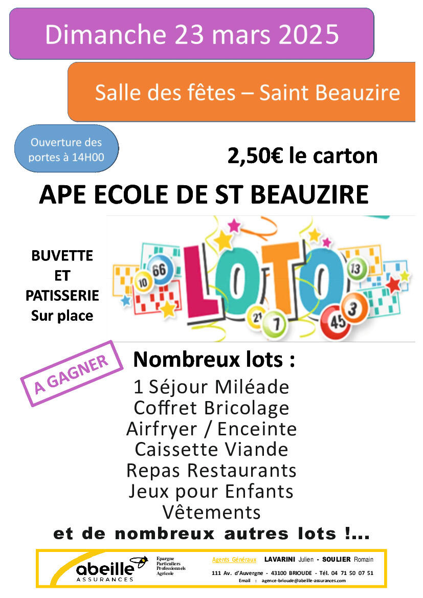 LOTO de l'école de SAINT-BEAUZIRE 15/3/25 Réservez votre dimanche le 23 mars pour le loto de l'école.
