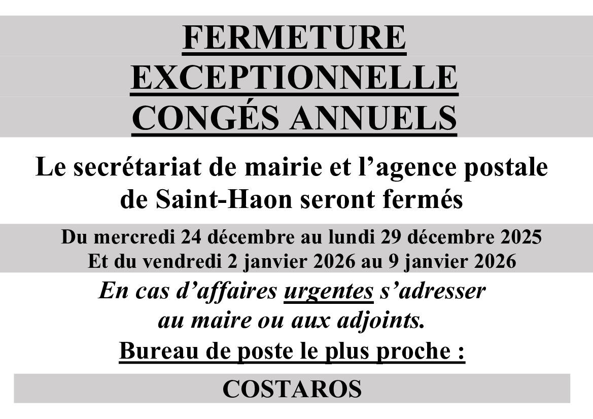 Le secrétariat de mairie et l'Agence postale de Saint-Haon seront fermés exceptionnellement