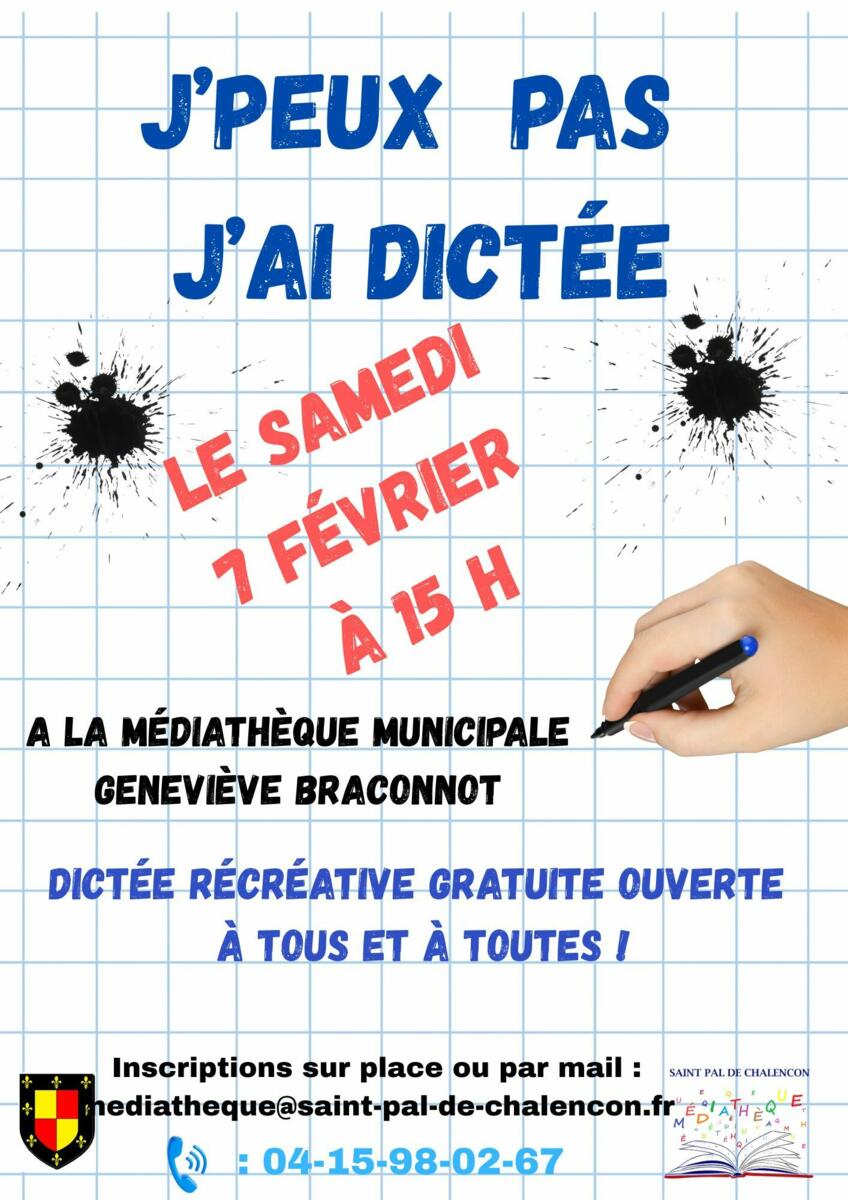 L'équipe de la médiathèque organise une dictée récréative, le samedi 7 février à 15 heures, à la médiathèque.