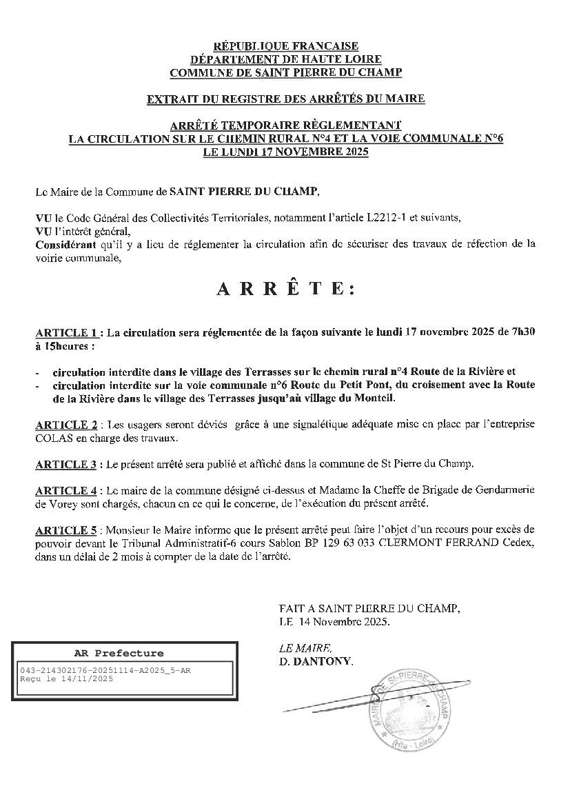 arrêté circulation Routes de la Rivière et du Petit Pont