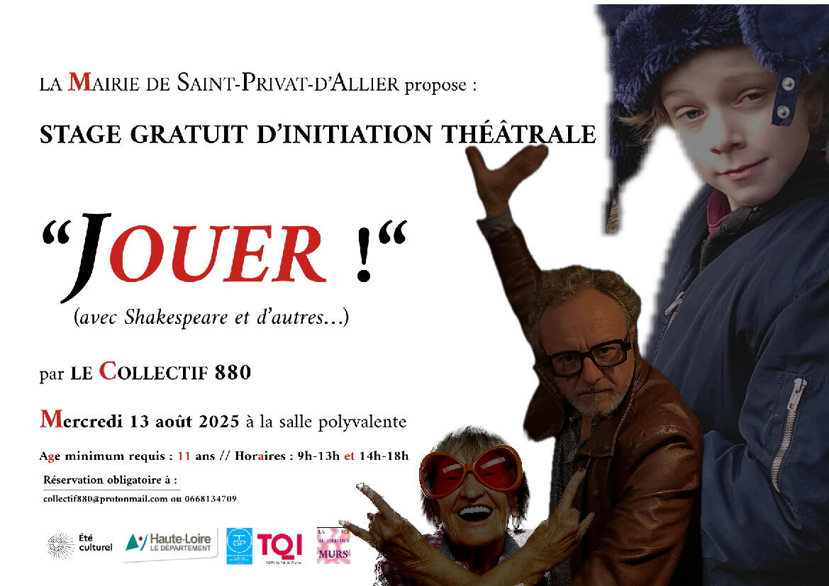 STAGE D'INITIATION THÉÂTRALE EN AOÛT 17/7/25 STAGE D'INITIATION THÉÂTRALE EN AOÛT par le COLLECTIF 880. Pensez à réserver, la jauge est limitée !"