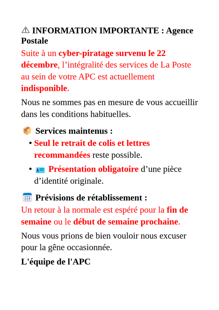 Information importante Agence Postale
