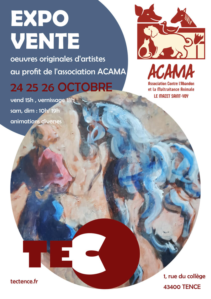 Comme chaque année depuis trois ans, une grosse exposition est organisée en soutien à l'ACAMA (Association Contre l'Abandon et la Maltraitance Animale) située au Mazet St Voy, qui assure un travail considérable et constant depuis une trentaine d'années. De plus en plus d'animaux sont abandonnés et retrouvés en mauvais état nécessitant des soins, les subventions baissent. Aussi il est très important d'aider la structure dont le bénéfice ira intégralement à l'ACAMA.