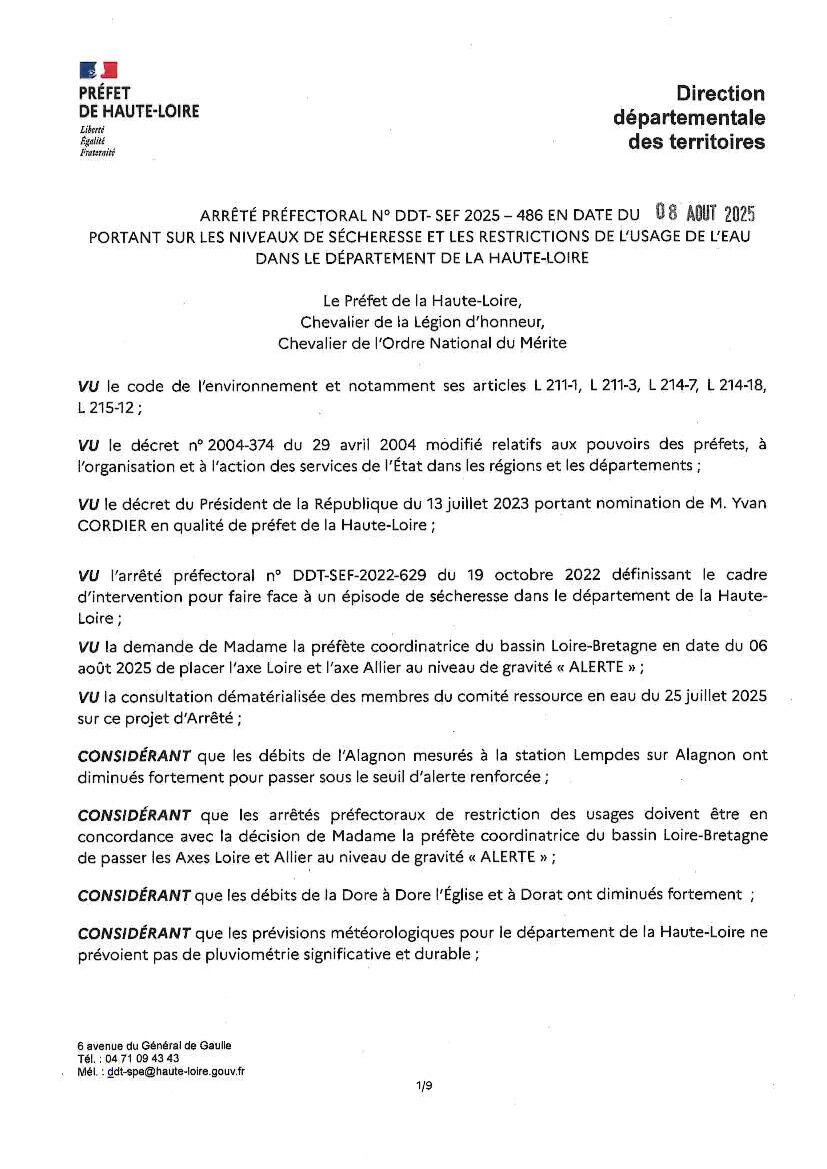 Vous retrouverez toutes les informations sur le site internet de la préfecture : https://www.haute-loire.gouv.fr/Actions-de-l-Etat/Secheresse-et-politique-de-l-eau ou le site https://vigieau.gouv.fr