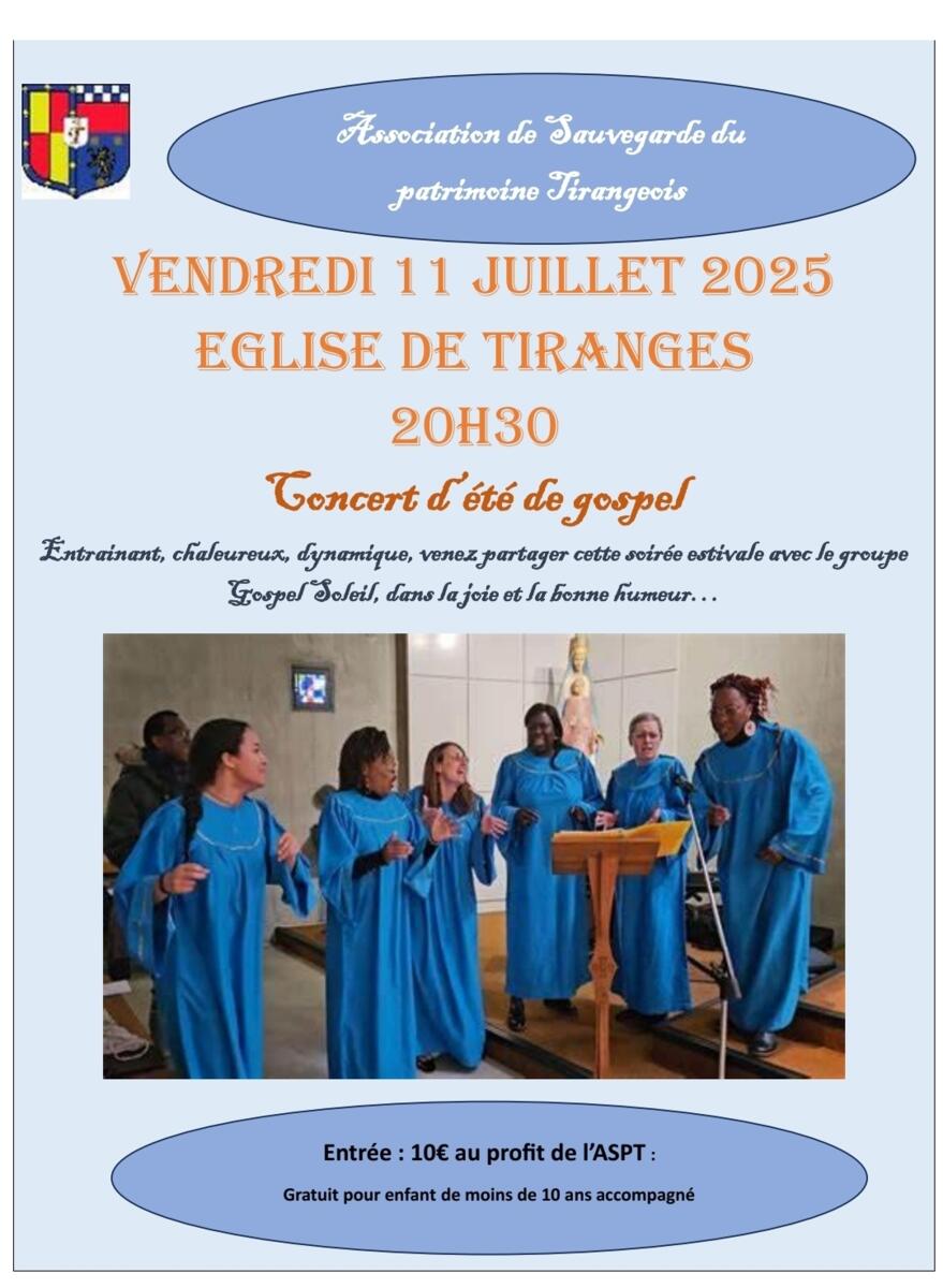 Concert de Gospel, avec le groupe GOSPEL SOLEIL le vendredi 11 juillet 2025 à 20h30 à l'église de Tiranges.