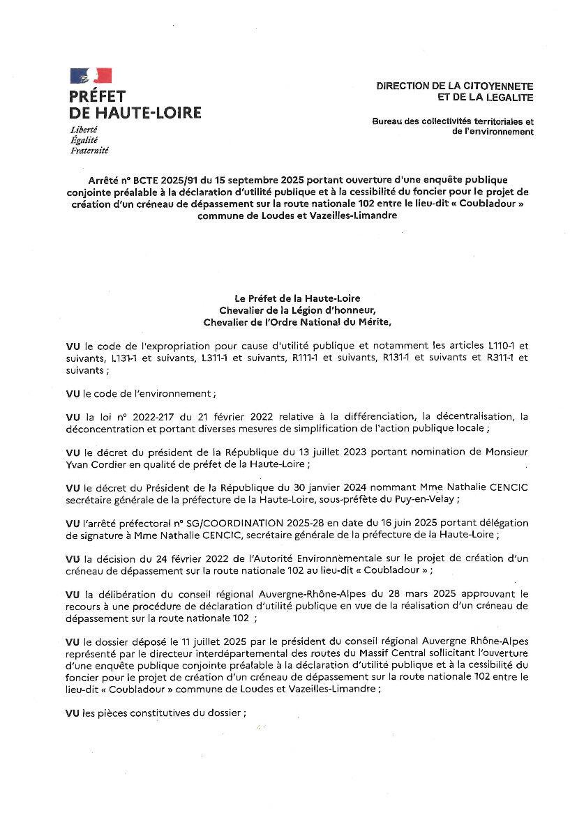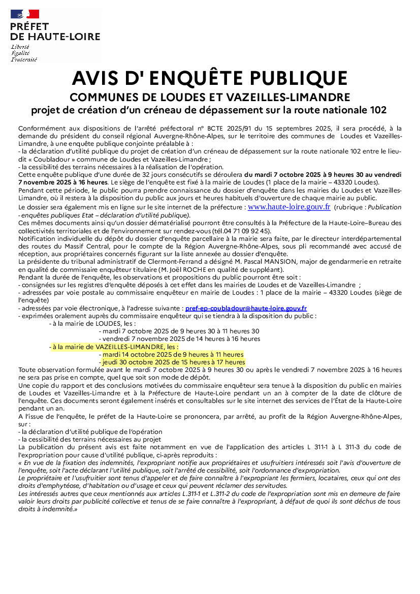 Enquête publique pour le projet de création d'un créneau de dépassement sur la route nationale 102 entre le lieu dit "Coubladour" commune de Loudes et Vazeilles-Limandre.