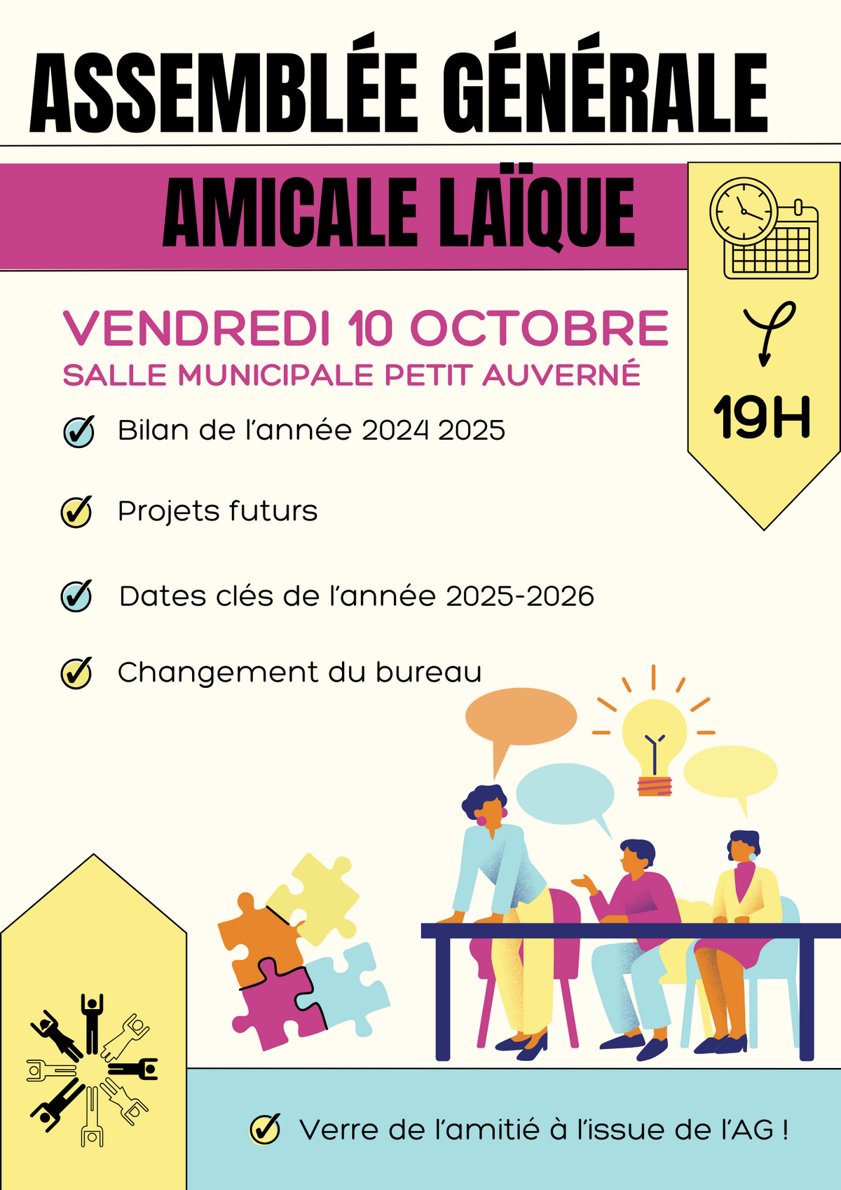 AMICALE LAIQUE 3/10/25 ASSEMBLÉE GENERALEVENDREDI 10 OCTOBRE A 19 H SALLE MUNICIPALE DU PETIT-AUVERNE