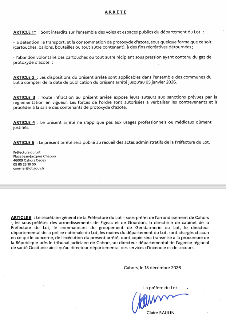Veuillez trouver ci-joint un arrête de Mme la Préfète règlementant la détention, le transport et la consommation de protoxyde d’azote.
