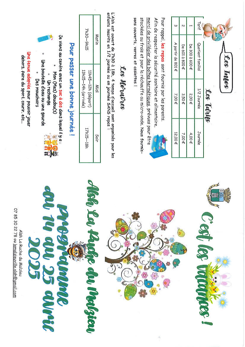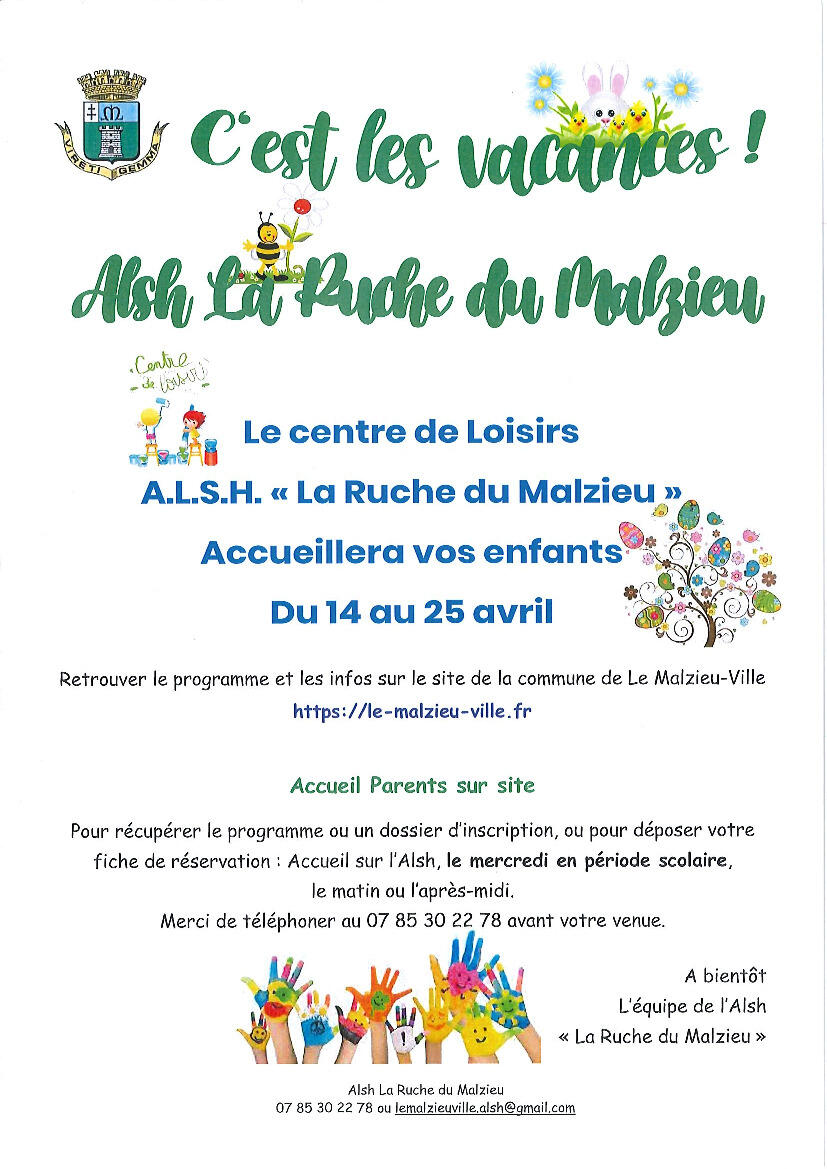 A.L.S.H "LA RUCHE DU MALZIEU" 23/3/25 LE CENTRE DE LOISIR A.L.S.H " LA RUCHE DU MALZIEU " ACCUEILLERA VOS ENFANTS DU 14 AVRIL AU 25 AVRIL