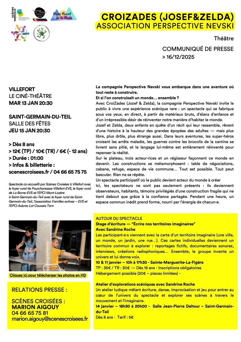 Avec CroiZades (Jozef & Zelda), la compagnie Perspective Nevski invite le public à vivre une expérience scénique rare : un spectacle qui se fabrique sous vos yeux, en direct, à partir de matériaux bruts, d’élans d’enfance et d’un irrépressible désir de réinventer notre manière d’habiter le monde. Jozef et Zelda, deux enfants en quête d’un récit qui leur ressemble, rêvent d’une histoire à la hauteur des grandes épopées des adultes — mais plus libre, plus drôle, plus étrange aussi. Dans leurs aventures, les super-héros croisent les arrêts maladie, les guerres contre les brocolis de la cantine se livrent sans pitié, et le langage lui-même est entièrement réinventé pour repenser la réalité. Sur le plateau, trois acteur·rices et un régisseur façonnent ce monde en devenir. Les constructions se métamorphosent : table de négociations, cabane, refuge, espace de vie commune… Tout est possible. Tout peut basculer. Rien ne se répète. Un spectacle participatif où le public devient acteur du monde à créer Ici, les spectateurs ne sont pas seulement présents : ils deviennent observateurs, habitants, témoins privilégiés d’une construction fragile qui ne tient debout que grâce à la confiance partagée. Pendant une heure, un espace commun inédit prend forme, nourri par l’énergie de chacun·e.