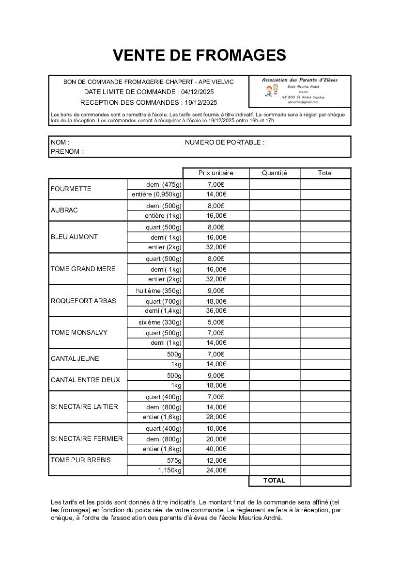 INFO - APE ECOLE DE VIELVIC - vente de fromages