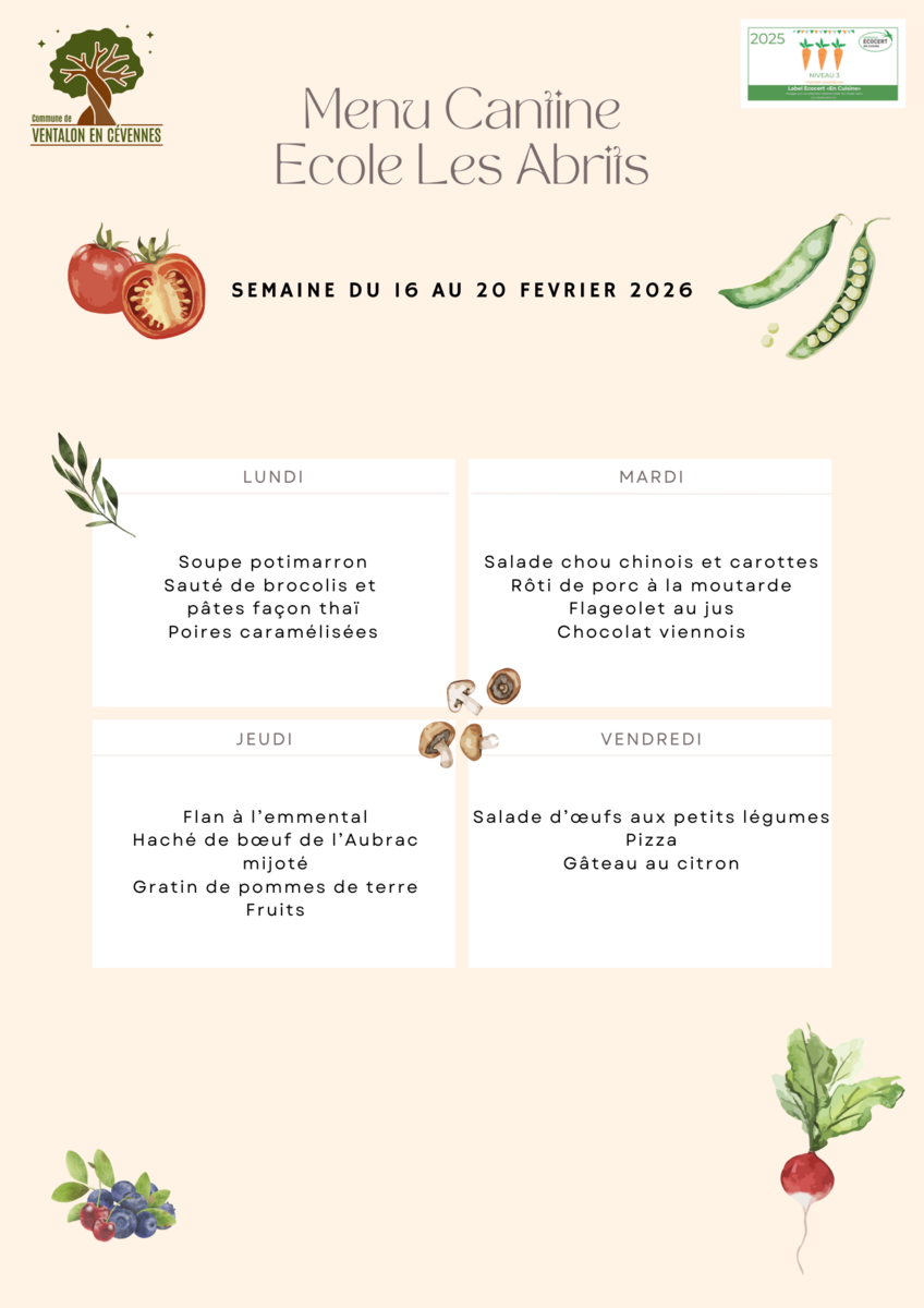 menu cantine du 16 au 20 février 2026 !