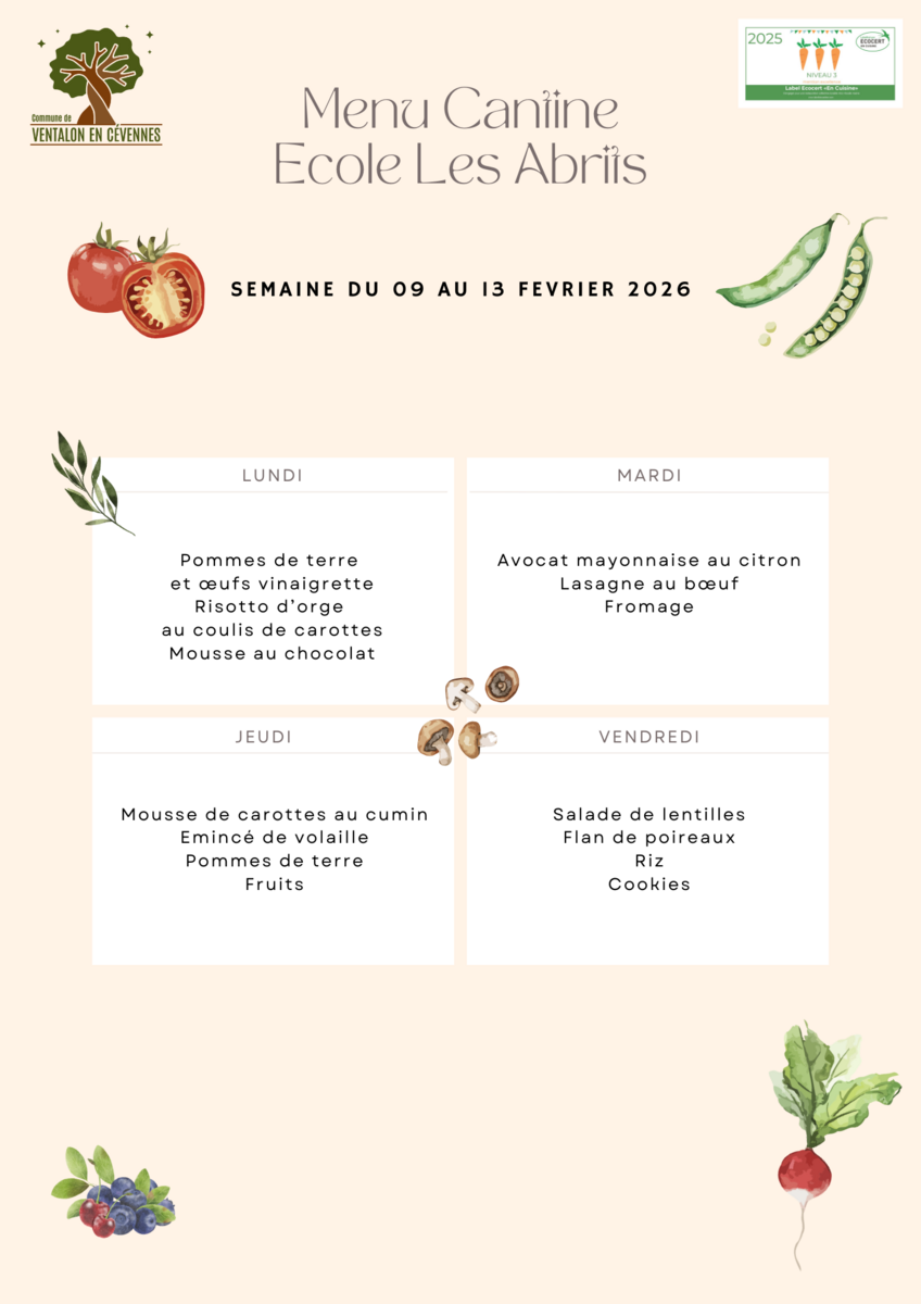 Menu cantine du 9 au 13 février 2026