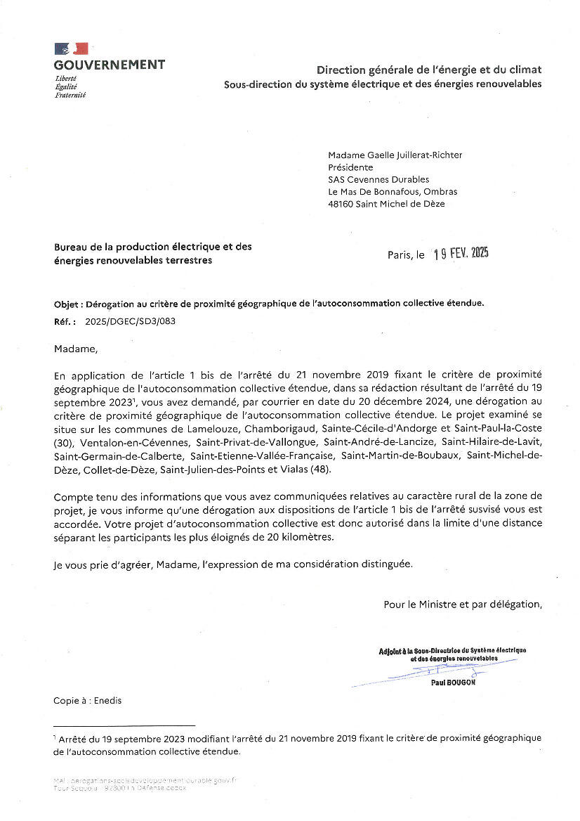 Vous trouverez annexé, le courrier reçu ce jour de l'Etat sur l'accord de notre projet d'autoconsommation collective.