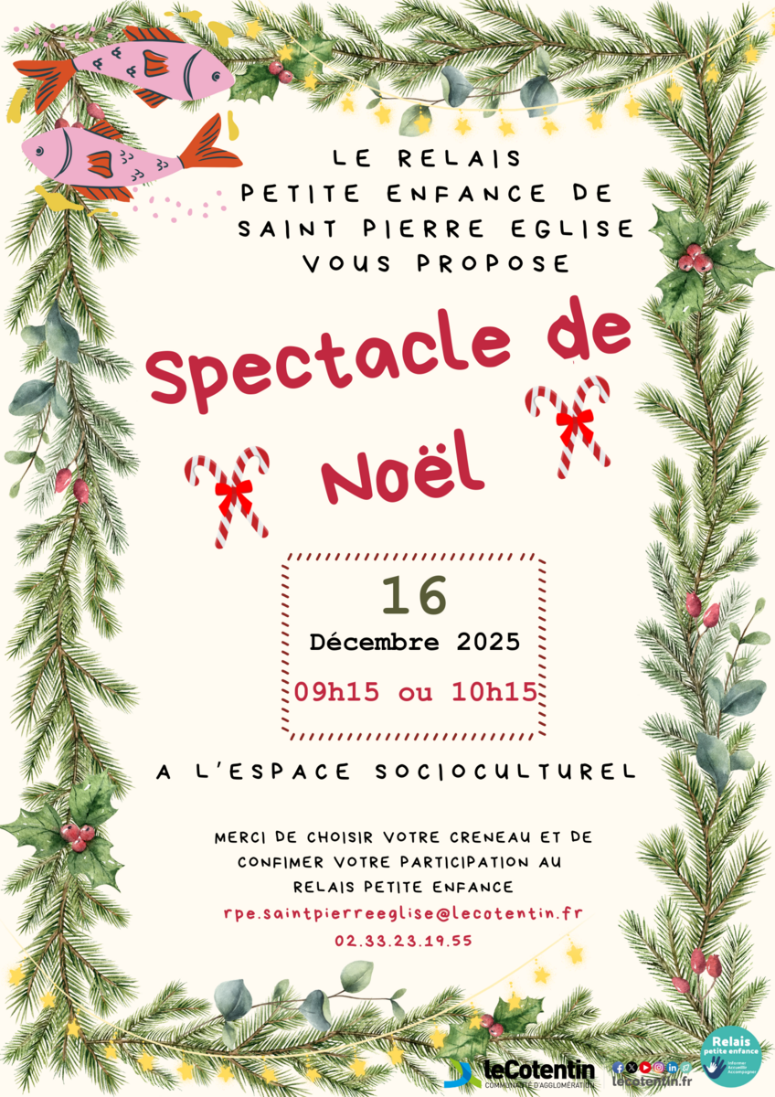 Puis un spectacle de fin d'année avec les enfants et les assistants maternels, mardi 16 décembre soit à 9h15, soit à 10h15, sur réservation 02 33 23 19 55 ou rpe.saintpierreeglise@lecotentin.fr
