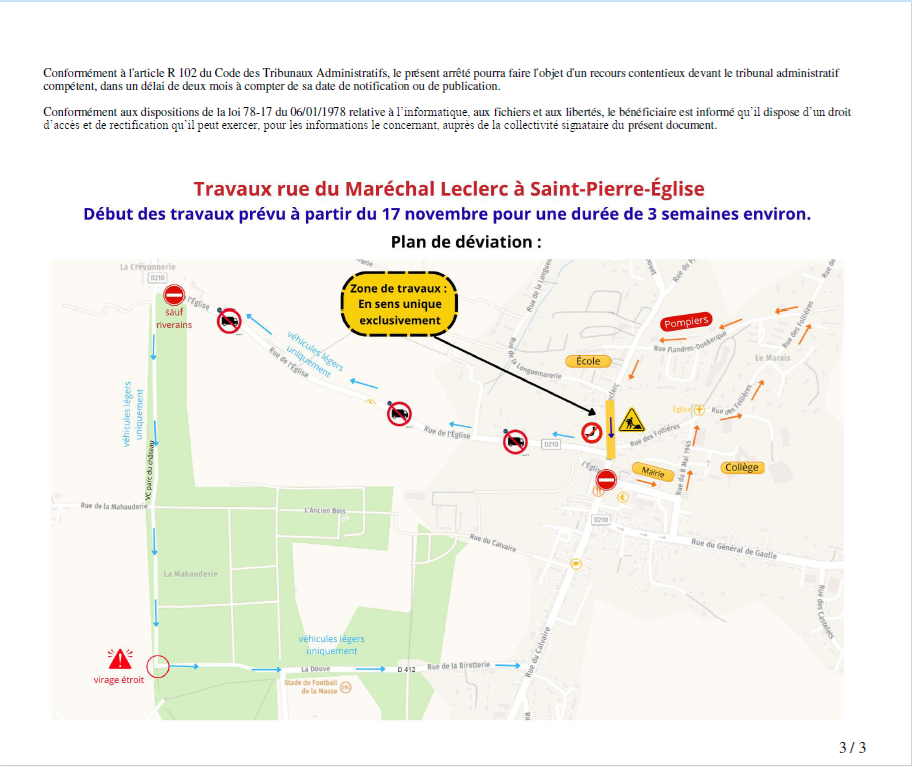Travaux prévus du 17/11/2025 au 19/12/2025, rue du Maréchal Leclerc, commune de Saint-Pierre Église, entre la maternelle et le stop au niveau de la Place de l'abbé Saint-Pierre.