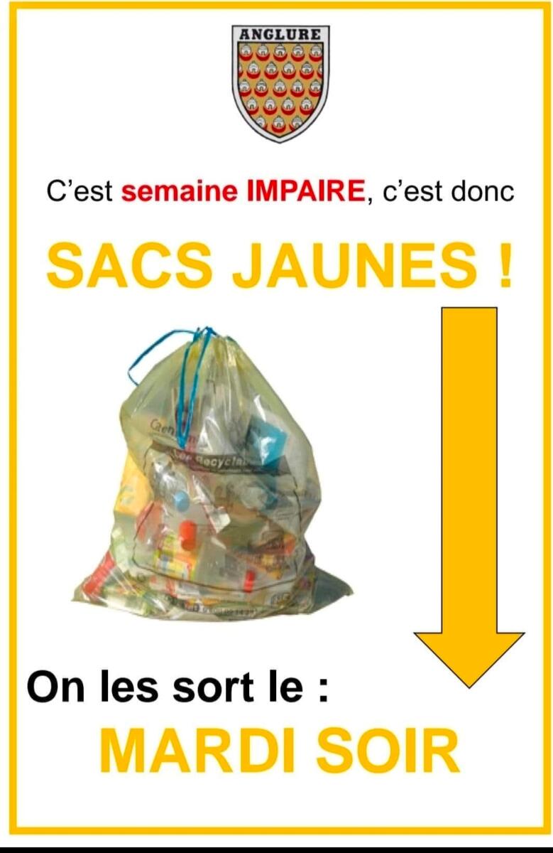 Collecte des sacs jaunes 10/2/26 Merci de déposer vos sacs jaunes sur le trottoir la veille du ramassage après 18h voire après 20h.