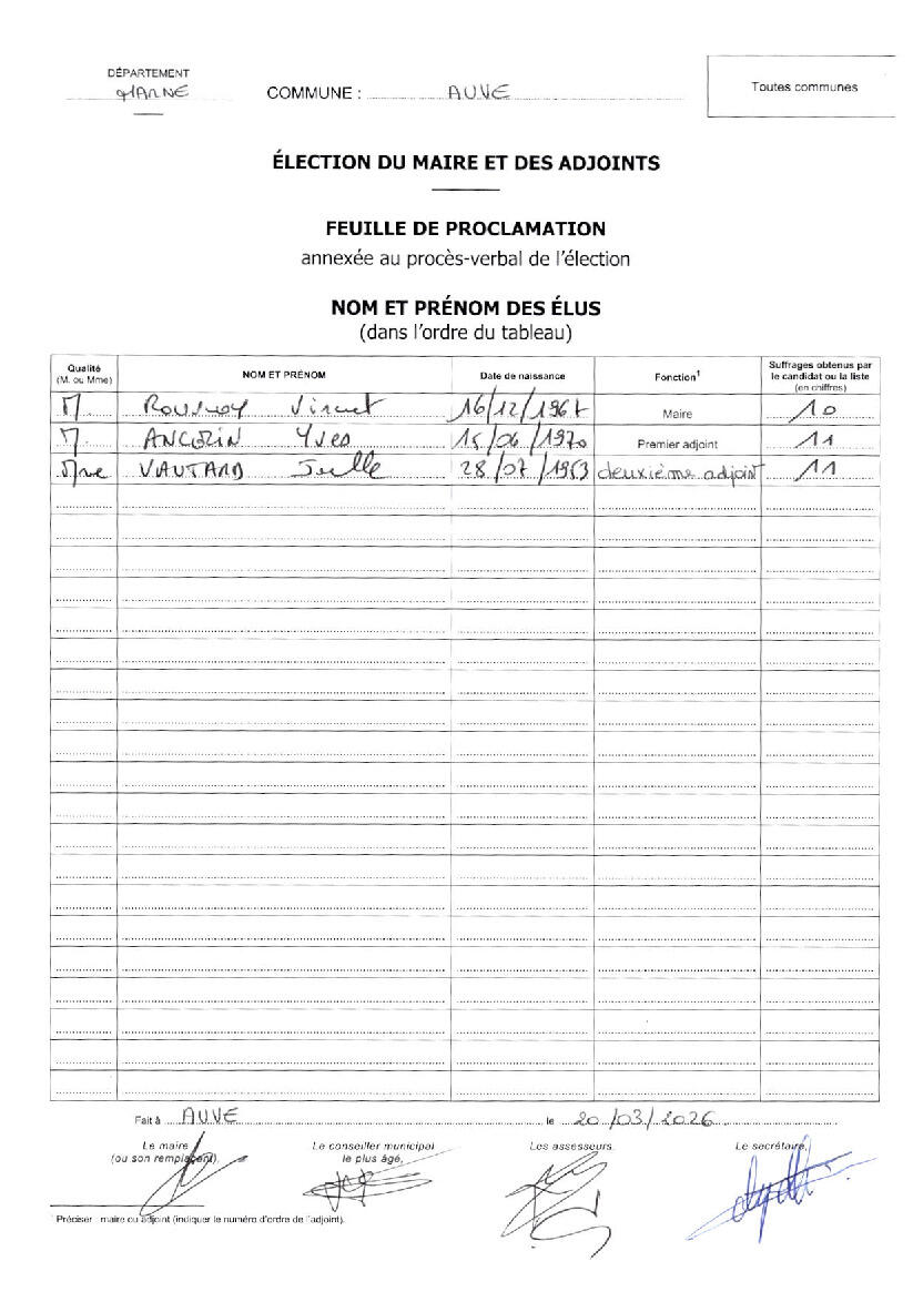 FEUILLE DE PROCLAMATION ELECTION DU 20 MARS 2026