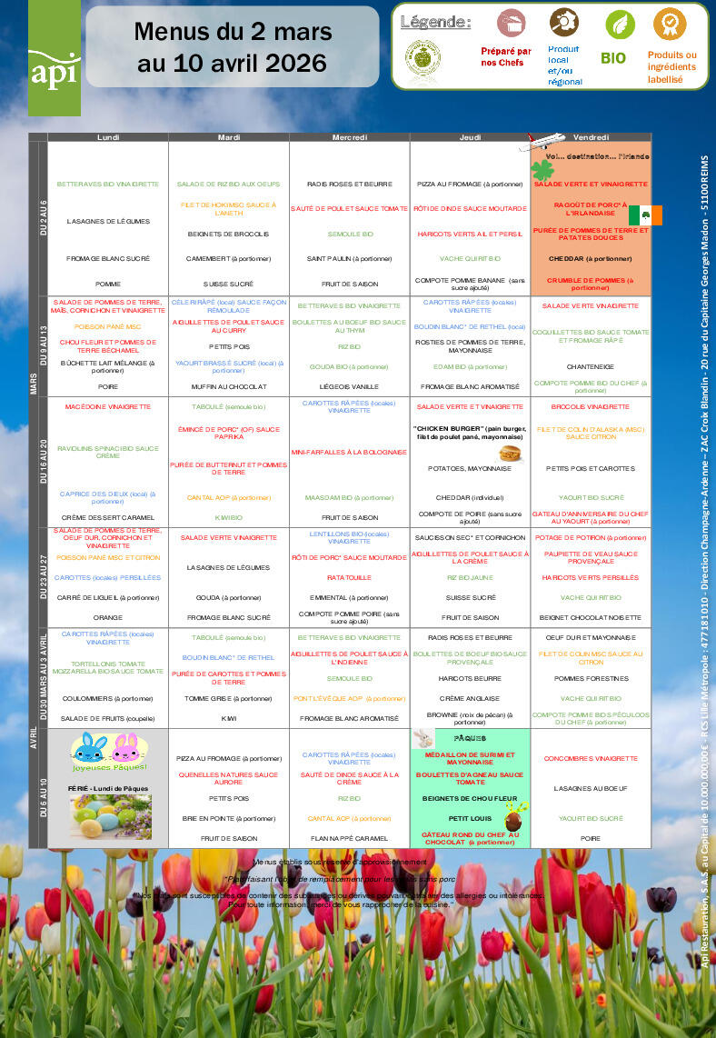 Menus de la cantine du 03 mars au 10 avril