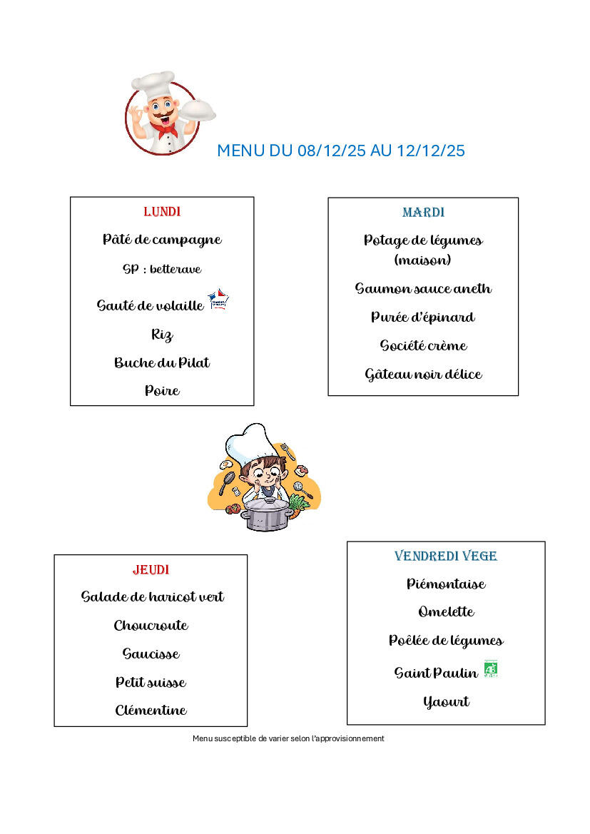 MENU DE LA CANTINE SCOLAIRE DU 08 AU 12 DECEMBRE 2025