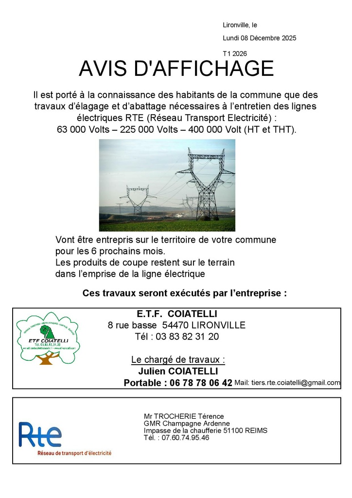 Sujet: Avis d'information travaux d'élagage et d'abattage lignes électriques RTE- T1 2026 CA - ETF COIATELLI