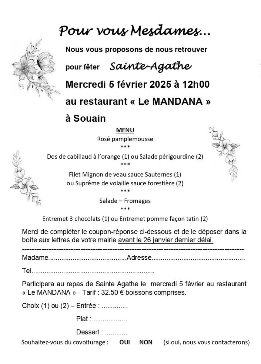 Le repas de Sainte Agathe aura lieu cette année au restaurant LE MANDANA à SOUAIN
