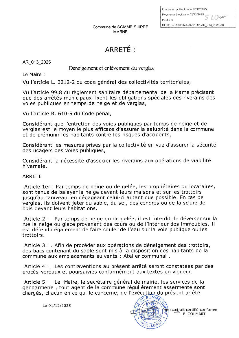 Su ayuntamiento / Noticias / ARRETÉ déneigement et enlèvement du verglas Somme-Suippe